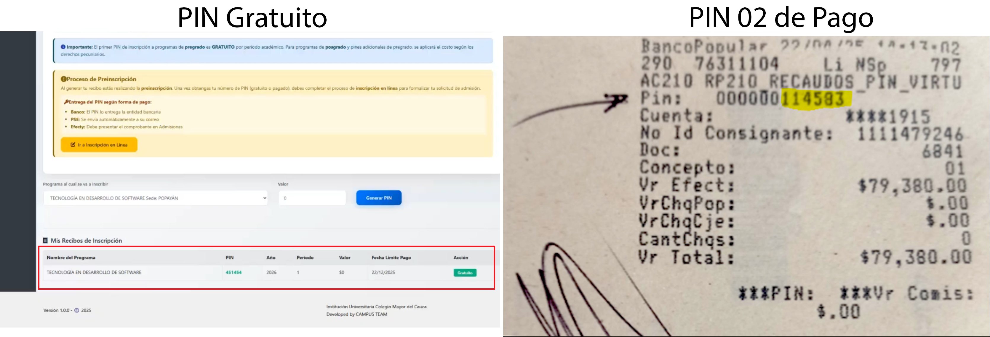 - Vaya al paso 2, pague el recibo de inscripción en Banco Popular o Puntos de Pago Autorizados y así obtendrá su PIN.